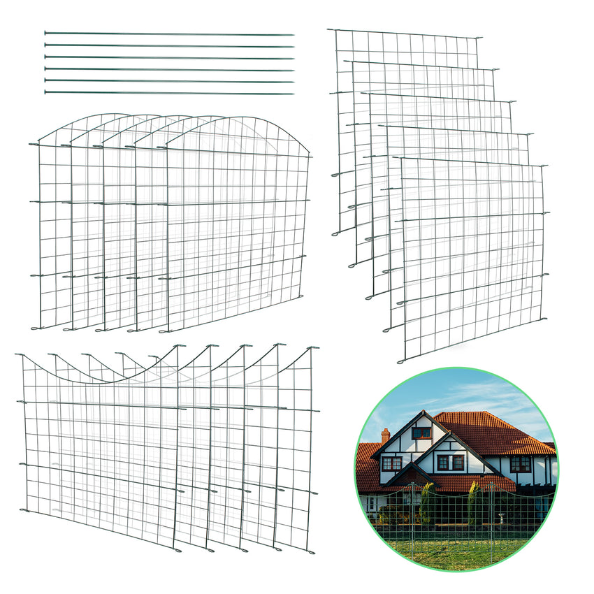 Der Teichzaun mit Oberbogen in Dunkelgrün ist bestens dafür geeignet, Ihrem Garten mehr Struktur zu verleihen. Dank dem praktischen Stecksystem kann der Zaun jederzeit versetzt, erweitert oder entfernt werden. Der Steckzaun lässt sich ganz einfach verbinden und im Boden verankern, ohne Fundamente setzen zu müssen oder Spezialwerkzeug zu nutzen. Aufgrund des flexiblen Systems sind auch kurvige Verläufe kein Problem. Der Zaun kann so als Dekoelement verwendet werden, verwehrt aber auch kleinen Kindern und Hunden den Zugang zum Teich oder anderen Bereichen des Gartens. Sie können den Steckzaun auch als Tiergehege nutzen, um etwa Hasen oder Meerschweinchen einen sicheren Auslauf zu ermöglichen.