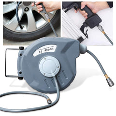 Das Schlauchstück, das am Kompressor angeschlossen wird, ist nicht verwechselbar oder verlängerbar. Und es kann nicht aufgerollt werden Wenn der Schlauch nicht automatisch zurückgezogen werden kann, können Sie eine bestimmte Strecke herausziehen oder vollständig herausziehen. Wenn das Zahnrad im Inneren des Gehäuses automatisch korrigiert wird, fährt der Schlauch automatisch zurück.