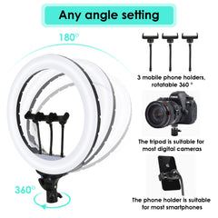 Helligkeit Verbessern:18 zoll LED Ringlicht mit 480 Stück LED-Lampenperlen.Die Beleuchtung kann von 1 bis 10 stufenlos(Sowohl Helligkeit als auch Farbtemperatur können eingestellt werden).Mit 3 Beleuchtungsmodi: warm, natürlich und kalt kann die Helligkeit 55W 6500K erreichen.Sowohl das LED-Ringlicht als auch der Handyhalter können um 360 ° gedreht werden, und Sie können den Modus und die Helligkeit bei verschiedenen Gelegenheiten an Ihre Beleuchtungsbedürfnisse anpassen.
