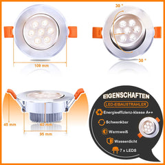 - Leuchtmitteln: Das praktische 12er Set 7W warmweiß LED Einbaustrahler hat festverbaute LED-Module mit einer hohen Lebensdauer von ca. 30.000 Stunden. 30° schwenkbar.