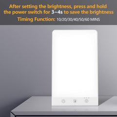 - Dimm- und Speicherfunktion: Die Tageslichtleuchte ist mit 3 Helligkeitsstufen. Berühren Sie lange den Ein-/Ausschalter, um die Helligkeit stufenlos von 10% bis 100% einzustellen. Nachdem Sie die gewünschte Helligkeit eingestellt haben, halten Sie die Timer-Taste 3 bis 4S gedrückt, um die Helligkeit zu speichern.