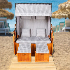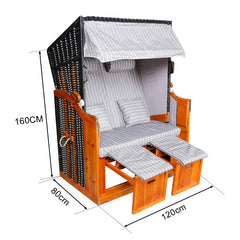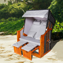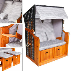• Der Strandkorb besteht aus grauweißen Streifen Quadraten und schwarzen Polyrattangeflecht, das aus wetterbeständigem Tropenholz hergestellt wird.