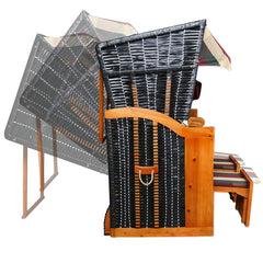 Der Strandkorb besteht aus grauweißen Streifen / rot-blau-weißen Quadraten und schwarzen Polyrattangeflecht, das aus wetterbeständigem Tropenholz hergestellt wird. Die Rückenlehne kann in Fünf Positionen arretiert werden. Sie können den Strandkorb in Liegekorb umwandeln.