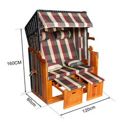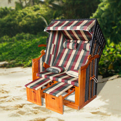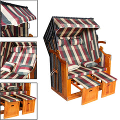 Der Strandkorb besteht aus grauweißen Streifen / rot-blau-weißen Quadraten und schwarzen Polyrattangeflecht, das aus wetterbeständigem Tropenholz hergestellt wird. Die Rückenlehne kann in Fünf Positionen arretiert werden. Sie können den Strandkorb in Liegekorb umwandeln.