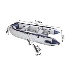Das 320 cm lange Schlauchboot kann am meisten 5 Personen und maximalen Ladegewicht von 566 kg annehmen.