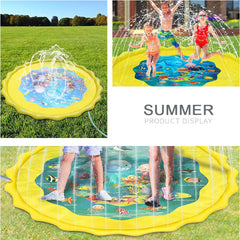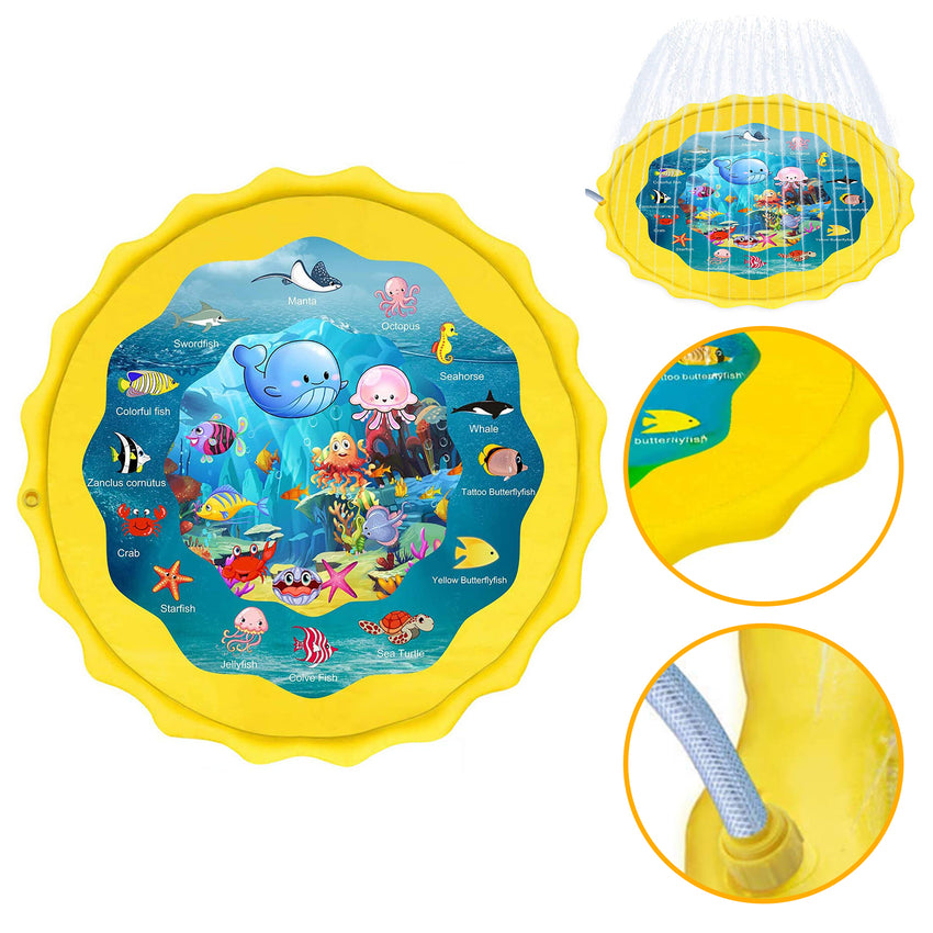 Sommer Spielmatte -- Ideal zum Entspannen, Sammeln oder Sammeln am Pool, im Garten oder am Strand. Auf der Wassermatte befinden sich farbenfrohe Meeresfiguren, die Ihnen fröhliche Wasseraktivitäten ermöglichen. Schließen Sie das Wassereinlassventil an den Gartenschlauch an, füllen Sie es mit Wasser und stellen Sie den Wasserdruck ein, um das Spray einzustellen.