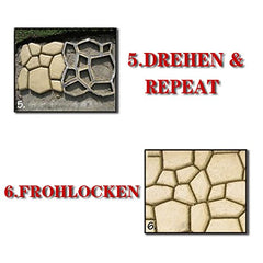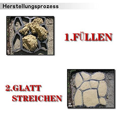 • 1.Form platzieren, 2.mit Zement/Beton befüllen, 3.mit Maurerkelle glattstreichen, 4.Form abheben