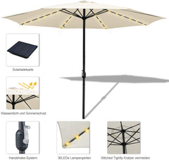 Die 36 LED Lampen sorgen mit ihrem stimmungsvollen Licht für ein angenehmes Ambiente. Strom liefert ein leistungsstarkes Solarpanel, das direkt oben am Schirm angebracht ist.Das Licht kann durch einen kleinen Schalter gesteuert werden.