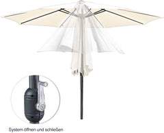 Die Spannweite beträgt ca. 300/350 cm. Der Regenschirm kann leicht mit einem Joystick geöffnet und geschlossen werden. Er ist leicht zu zerlegen und platzsparend.
